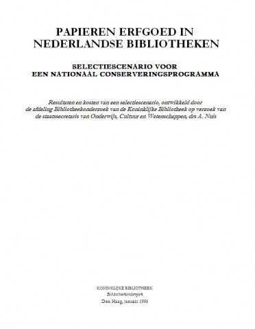 Titel | Papieren erfgoed in Nederlandse bibliotheken: selectiescenario voor een nationaal conserveringsprogramma |