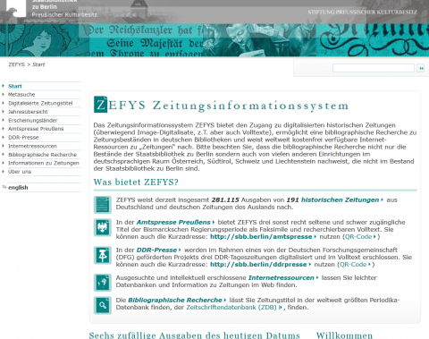Samenvatting | ZEFYS, acroniem voor ZEitungsinFormationsYStem, werd uitgebouwd als de portaalwebsite voor gedigitaliseerde kranten van de Staatsbibliothek zu Berlin. U vindt er meer dan 190 historische krantentitels uit Duitsland en daarbuiten (ingeval ze in het Duits geschreven zijn). Het gaat onder andere om 'Berliner Gerichts-Zeitung' (1853-1869), 'Deutsch-Ostafrikanische Zeitung' (1899-1916), 'Die Feder' (1898-1917), 'Neustädter Kreisblatt' (1852-1911) en 'Reichswart' (1920-1936). |